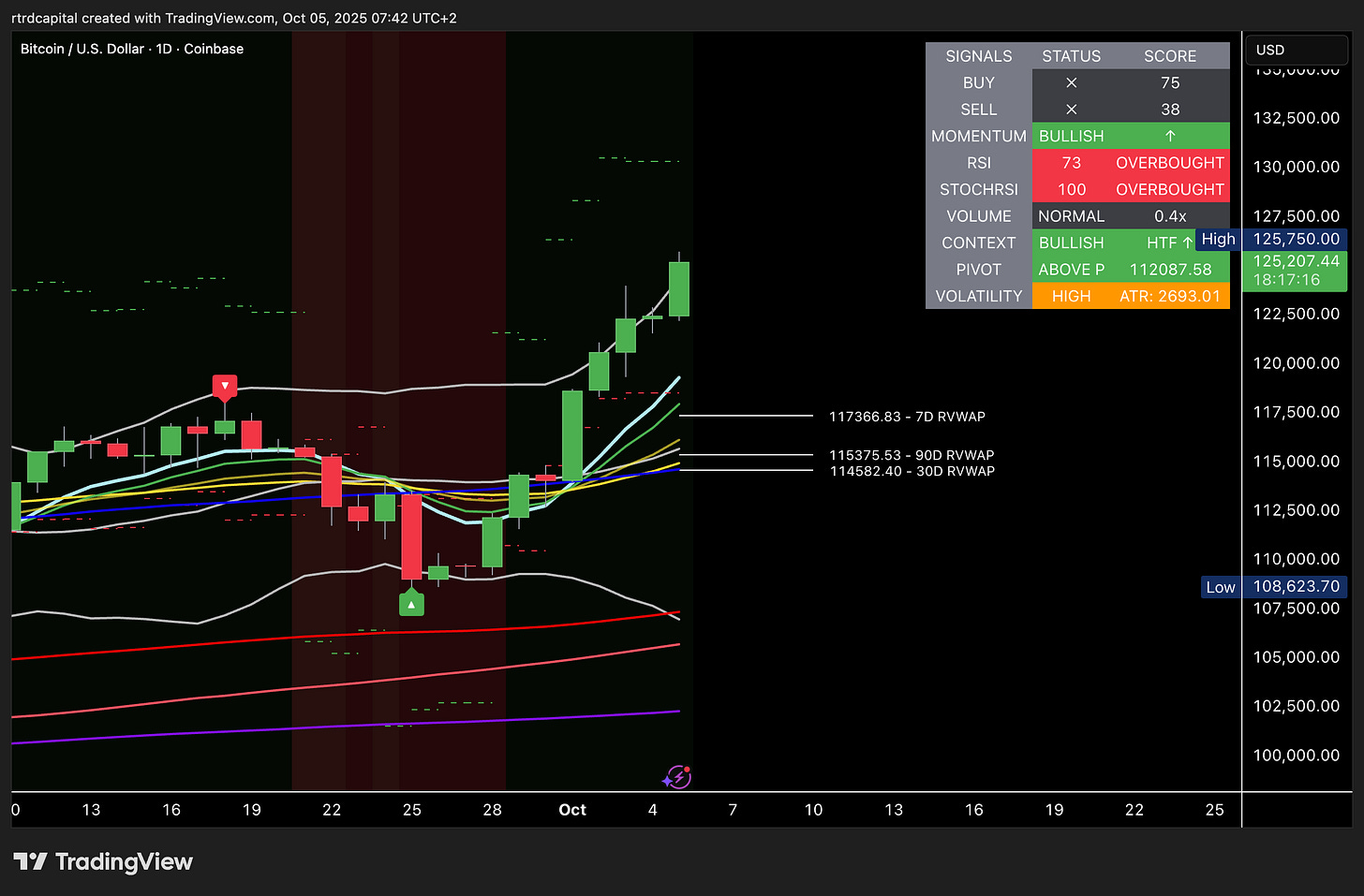 Key idea: over the next 2–6 weeks the base case is sideways-to-up, with likely pullbacks toward 120K and attempts at 127–130K. Near-term, the market is overbought (RSI ~73, StochRSI 100), so the preferred tactic is buying dips rather than chasing highs.