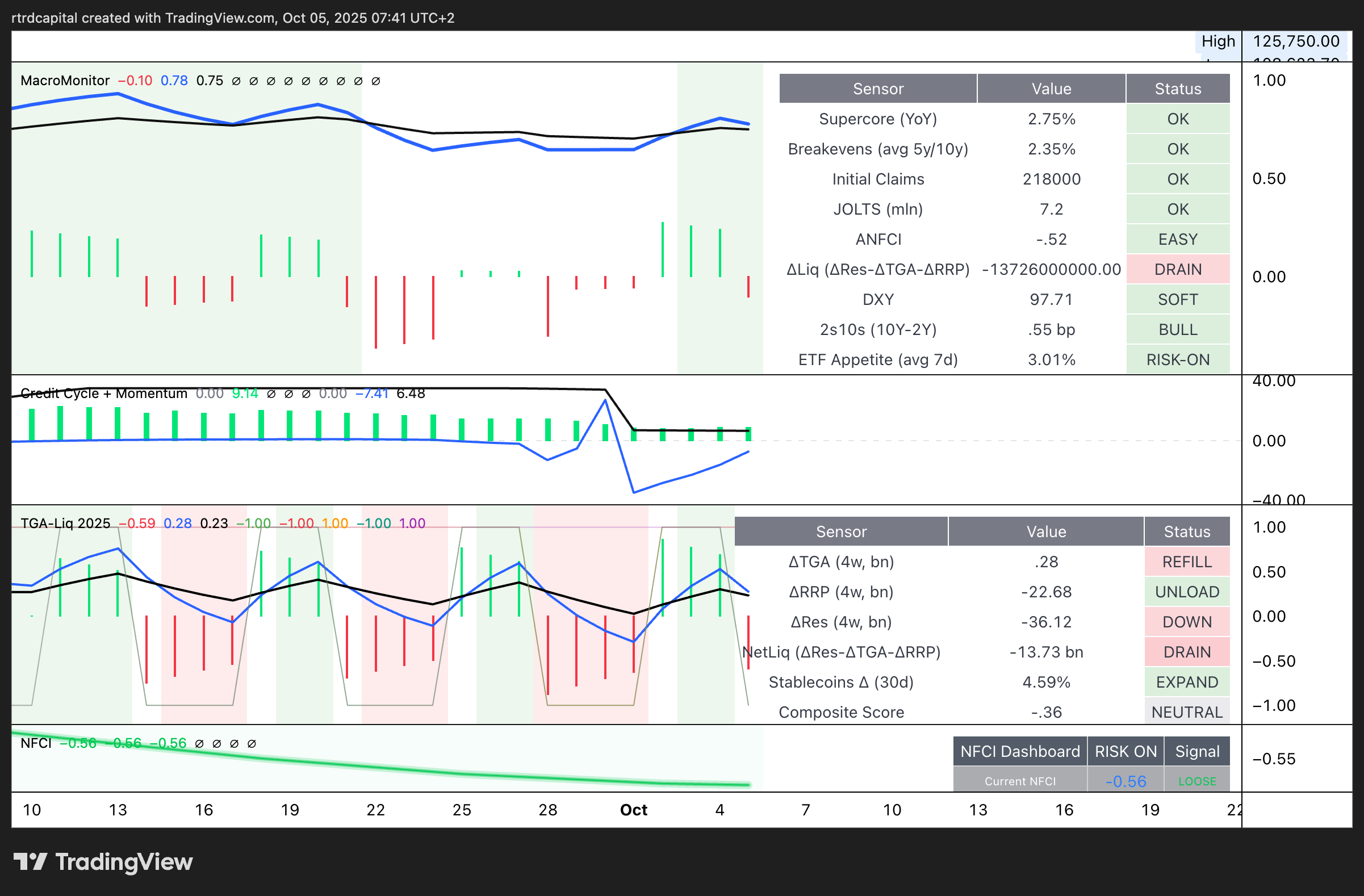 Operating liquidity: our dashboard shows a 4-week net-liquidity drain (ΔRes – ΔTGA – ΔRRP), while NFCI ≈ −0.56 — financial conditions remain easy. The official NFCI for the week to Sep 26 printed −0.56.