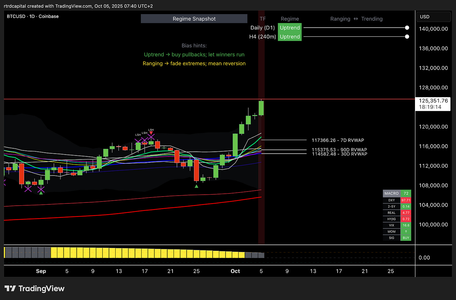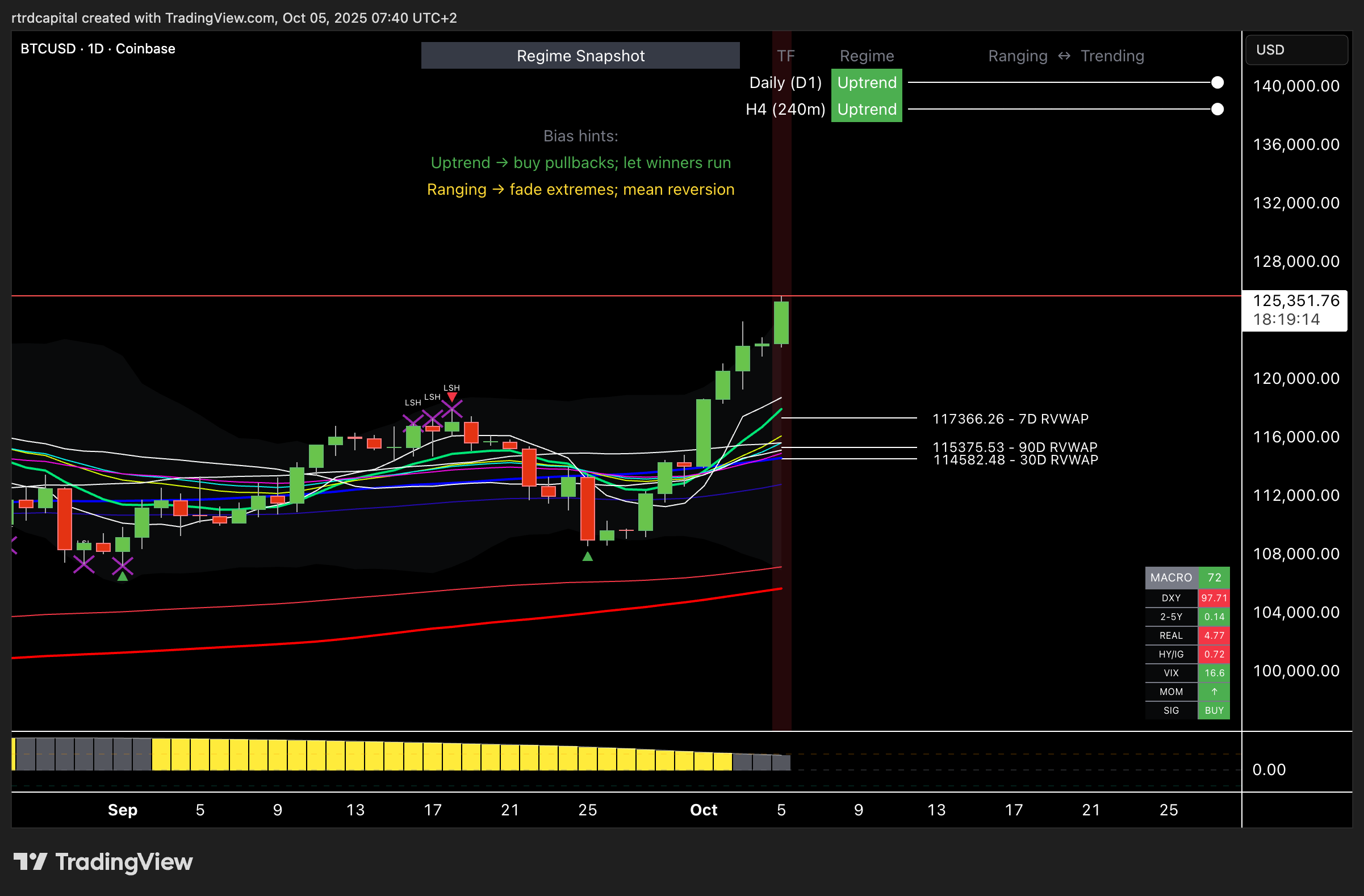 Technical takeaway: trend is bullish, price is stretched above MAs and RVWAPs. Typical resolution is a cool-off into ~117–115K or range to refresh oscillators while preserving structure.