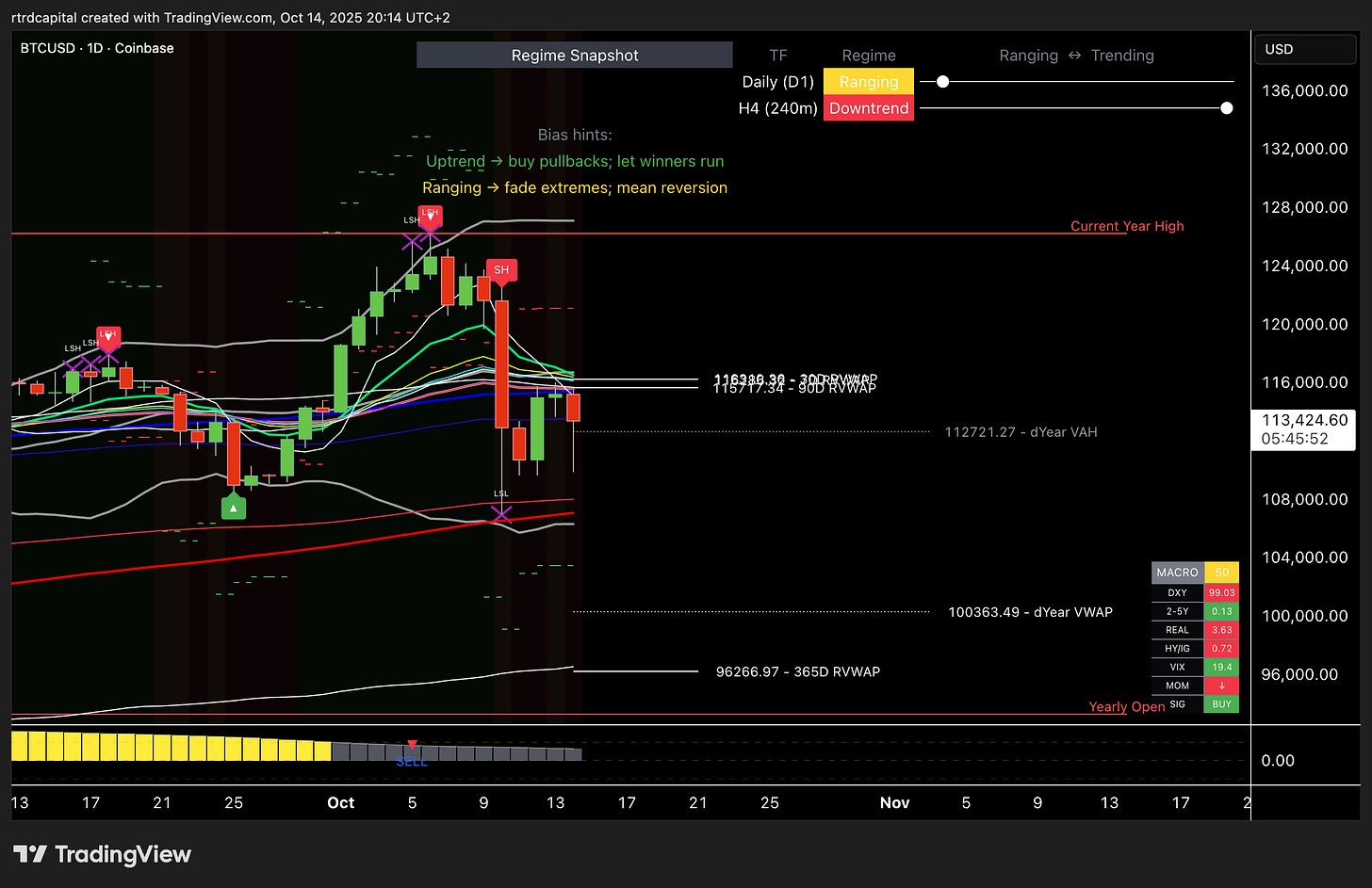 Right now $BTC is trading into a cluster of heavy resistances. Starting at 114,800, there’s a stack of levels where price can get slapped. But, as I said up top, the key resistance is 116.3K (30D RVWAP + H1 EMA200). A reclaim and hold above that opens the path to 125K+, a rejection there or at any level from 114.8K up - can extend the slide below 110K.
